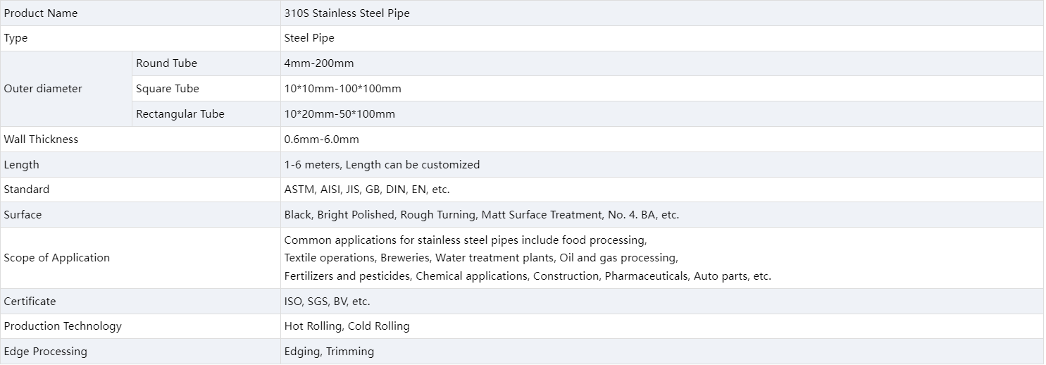 310S stainless steel pipe has good oxidation resistance, corrosion resistance, acid and alkali resistance given its high content of nickel (Ni) and chromium (Cr). The strength is improved due to its solid solution strengthening effect after adding the content of carbon in austenitic stainless steel,. The chemical composition characteristics of austenitic stainless steel are based on chromium and nickel to add molybdenum, tungsten, niobium and titanium, and because of its face-centered cubic structure, it has high strength and creep strength at high temperatures. 310S stainless steel is often used in the manufacture of boiler, steam turbine, industrial furnace and aviation, petrochemical.