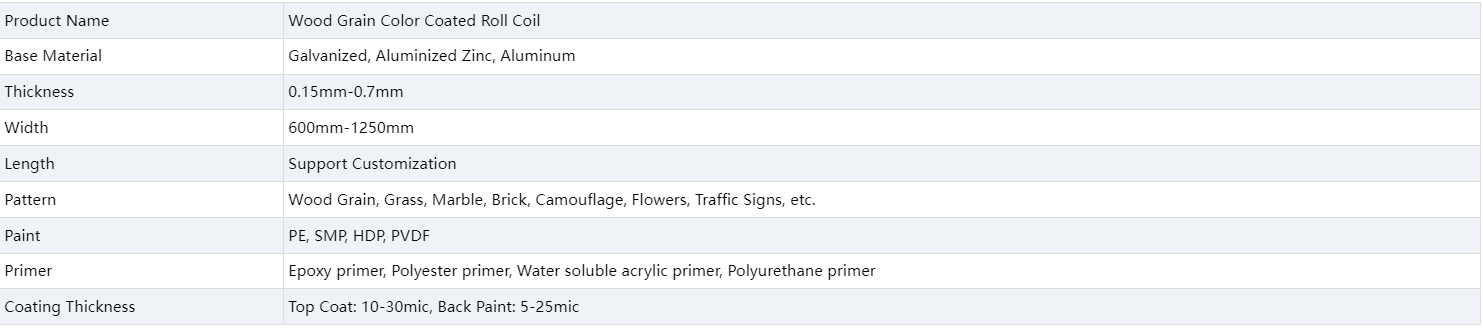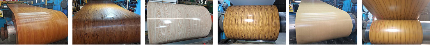 Wood grain color coated roll coil is made of refractory materials, such as steel and aluminum, which makes it an excellent choice for areas prone to wildfires or areas where fire safety is a concern. Unlike solid wood, wood grain board is not easy to rot, deform and crack. It also has strong resistance to impact and weather damage, which makes it ideal for harsh environments. Compared to solid wood, wood-like metals require minimal maintenance. It can be easily cleaned with a hose or high-pressure washer, and will not fade or discolor over time. Wood grain color coated roll coil products are widely used in construction, such as wall panels, siding, garage doors, fences, etc., and are also very popular in decoration and furniture.