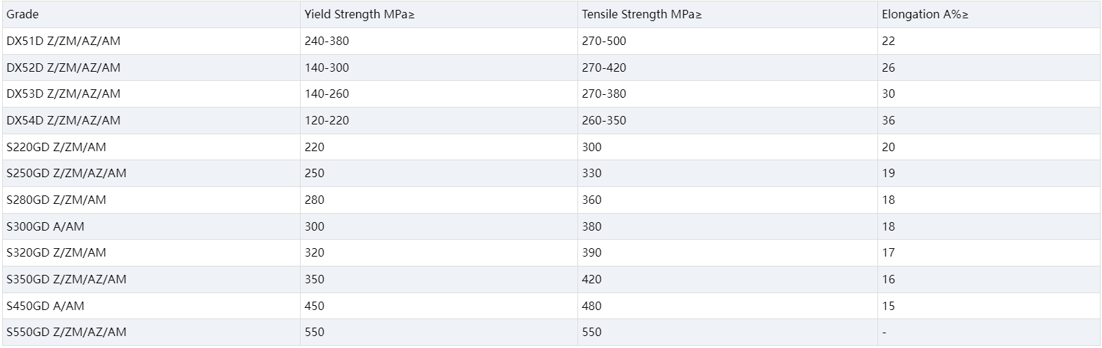 DX51D galvanized sheet is divided into cast zinc alloy and deformed zinc alloy. Commonly used cast zinc alloy is zinc aluminum copper magnesium alloy, its casting process performance is good, cooling speed has less effect on mechanical properties, more used in the manufacture of mechanical parts, toys, decorations, household appliances and so on. Commonly used deformation zinc alloys are zinc aluminum alloy and zinc copper alloy. The former contains 4% to 15% aluminum, in order to improve the strength and hardness of the alloy, but also add a small amount of copper, magnesium and other alloying elements. Its high strength can replace some brass or duralumin manufacturing precision forgings. The latter contains 0.7% to 1.5% copper, copper can increase alloy strength and impact toughness, and reduce plasticity.