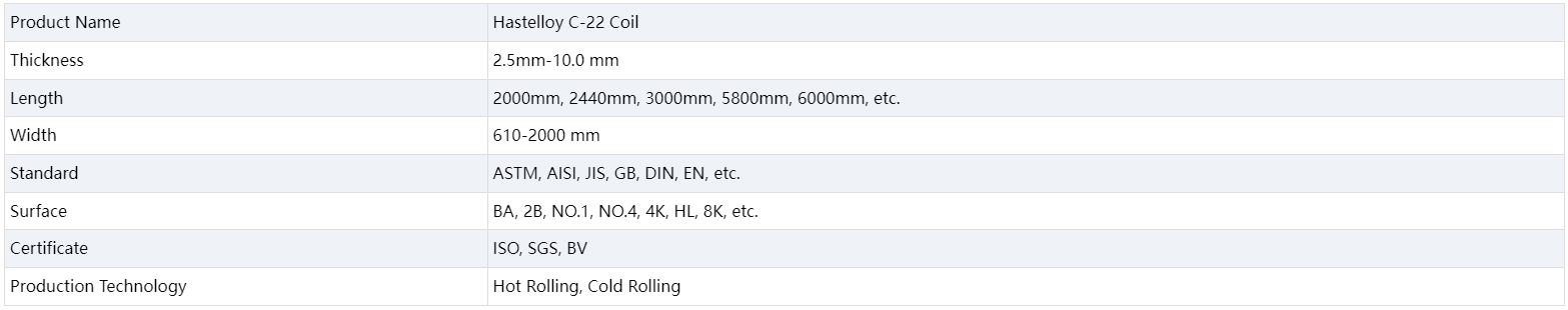 The main elements of Hastelloy C22 coil include cobalt, chromium, tungsten, molybdenum and small amounts of aluminum, titanium and nitrogen. Among them, cobalt element can improve the strength and hardness of the alloy, chromium element has an important impact on the corrosion resistance of the alloy, tungsten and molybdenum can improve the high-temperature strength of the alloy. In addition, the addition of aluminum and titanium elements can help refine the grains and improve the toughness of the alloy, while the addition of nitrogen can improve the strength and corrosion resistance of the alloy. Besides, it has good plasticity and toughness and can be used for cold and hot processing. Hastelloy C22 coil also exhibits excellent oxidation resistance and creep resistance at high temperatures. Hastelloy C22 coil is widely used in aerospace, chemical industry, petroleum and other fields because of its excellent corrosion resistance and high temperature strength.