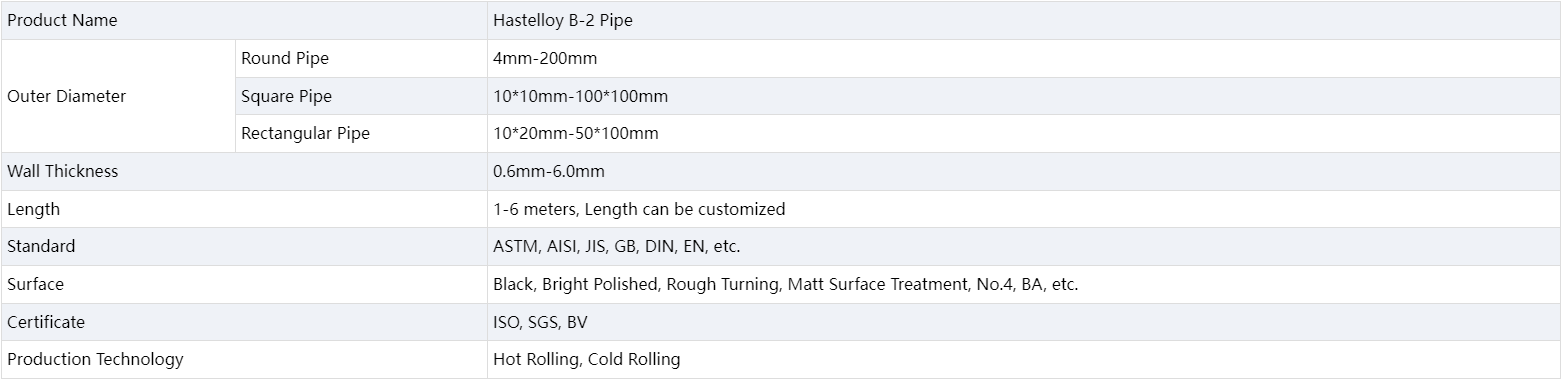Hastelloy B2 pipe has a chemical composition mainly including nickel, chromium, molybdenum and a small amount of iron, tungsten and other elements. The combination of these elements leads to excellent corrosion resistance and high-temperature strength. Among them, the nickel element provides good corrosion resistance, the chromium element enhances the material's corrosion resistance in an oxidizing environment, and the molybdenum element improves the material's corrosion resistance in a reducing environment. Moreover, the addition of elements such as iron and tungsten further add to the strength and hardness of the material. Hastelloy B2 pipes have good processing properties and can be used for hot processing and cold processing. Hot processing includes casting, hot rolling, heat treatment and other processes, while cold processing includes cold rolling, cold drawing, stamping and other processes.