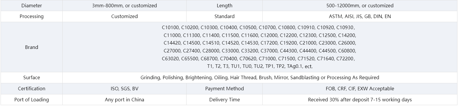 C10100 copper bar’s extremely high purity gives it excellent electrical and thermal conductivity, other than good plasticity and ductility, making it highly flexible in processing. In addition, C10100 copper alloy has exceptional corrosion resistance and can stay stable and unaffected in a range of environments, including marine environments. Besides, C10100 copper bars can be processed in a variety of ways, including rolling, drawing, die casting and forging with high purity and good physical properties. C10100 copper bars are suitable for manufacturing various bearings, screws, nuts and other mechanical parts as well as automobile parts. Due to its corrosion resistance and ability to withstand high temperatures and pressures, C10100 copper bars are also used in the manufacture of chemical equipment and chemical reactors.