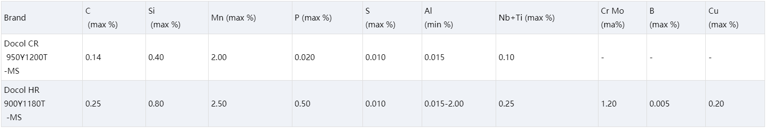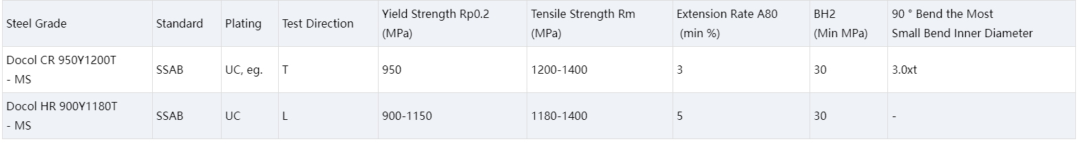 Docol 1200M: Docol1200M available as hot-rolled and cold-rolled steel, Docol1200M martensitic steel contributes to improved crashworthiness and provides a reliable guarantee for lightweight design and cost-effective production in the automotive industry. Docol is one of the cold-rolled high-strength steels on the market and has become a material for applications such as side anti-collision beams, bumpers and structural parts in the automotive industry.